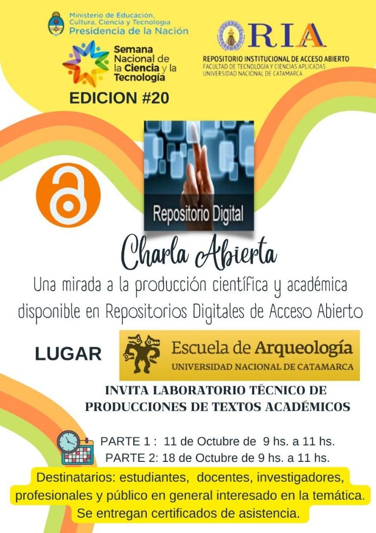 El pasado 11 de octubre se realizó la primera parte de la Charla Abierta “Una mirada a la producción científica y académica disponible en Repositorios Digitales de Acceso Abierto”, en la Escuela de Arqueología de la Universidad Nacional de Catamarca.