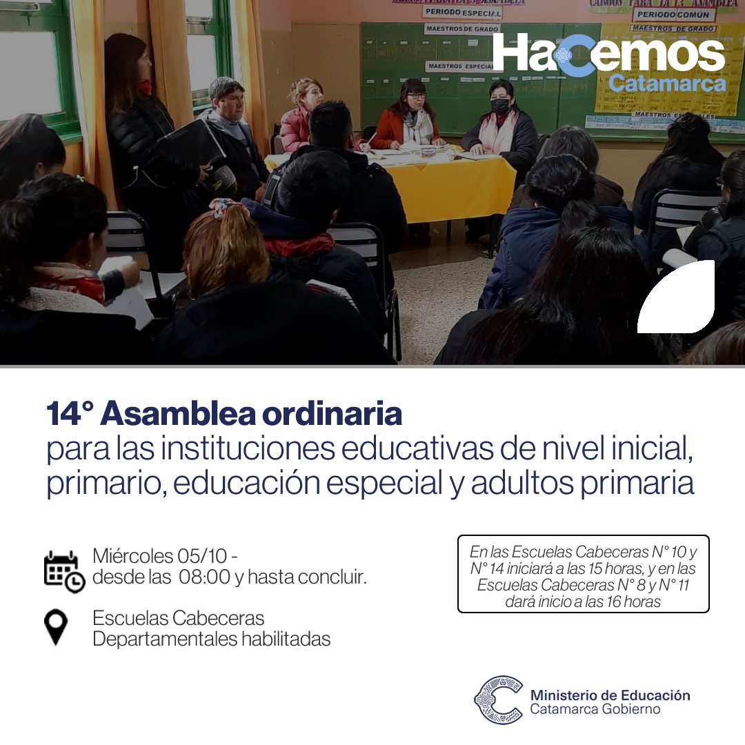 El Ministerio de Educación a través de la Secretaría de Gestión Educativa comunica que por Resolución SGE (ME) N° 94/2022 se autoriza a la realización de la 14° Asamblea ordinaria de opción para la cobertura de cargos interinos y/o suplentes para las instituciones educativas de los Niveles Inicial, Primario, Educación Especial y Adultos Primaria de Gestión Estatal Pública, a llevarse a cabo el día miércoles 5 de octubre de 2.022 en las Escuelas Cabeceras Departamentales habilitadas, a partir de las 08:00 horas.