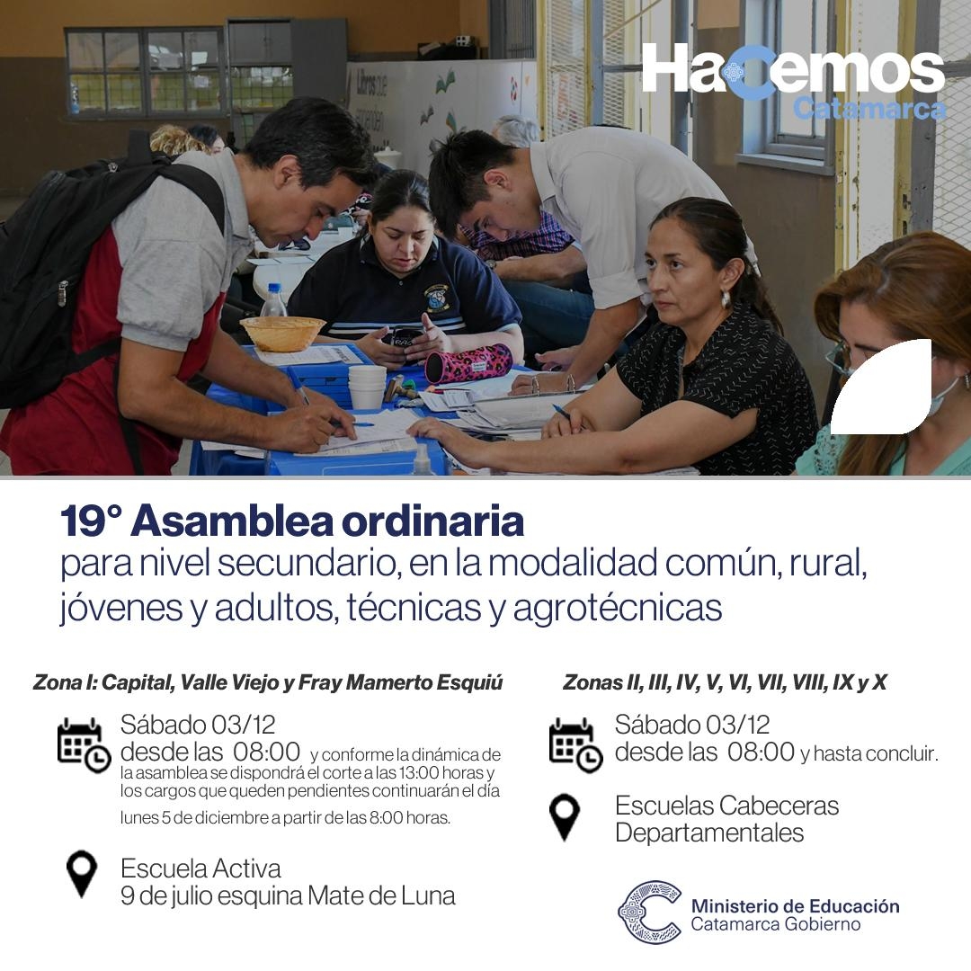 La correspondiente a Zona I: Capital, Valle Viejo y Fray Mamerto Esquiú se realizará en instalaciones de “Escuela Activa”, sito en calle 9 de julio 1.015 (esquina Mate de Luna) de San Fernando del Valle de Catamarca a partir de las 8:00 horas y conforme la dinámica de la asamblea se dispondrá el corte a las 13:00 horas y los cargos que queden pendientes continuarán el día lunes 5 de diciembre a partir de las 8:00 horas.
