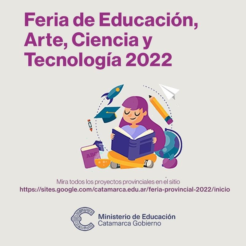 La Coordinación de Actividades Científicas y Tecnológicas Juveniles (ACTJ), del Ministerio de Educación invita al público a conocer y disfrutar las más de 100 producciones que accedieron a la instancia provincial de la Feria de Educación, Arte, Ciencia y Tecnología Virtual 2022, en el sitio https://sites.google.com/catamarca.edu.ar/feria-provincial-2022/inicio