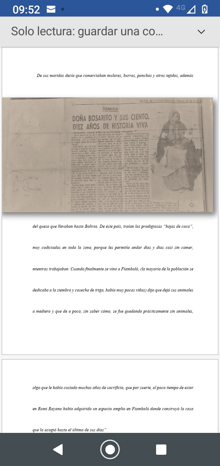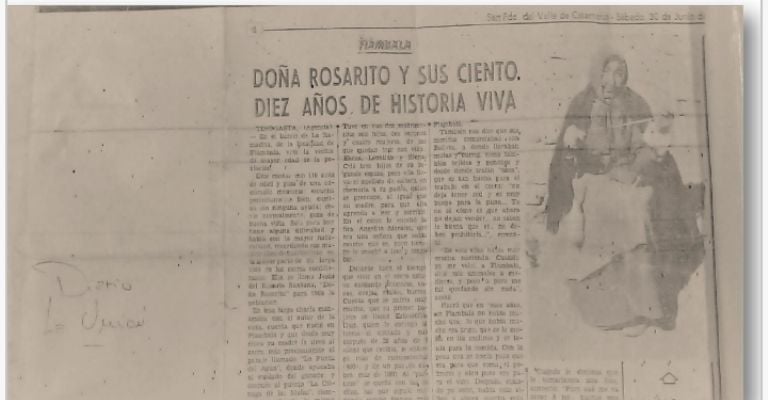 De manos de Ramón Quiroga, también llegó providencialmente un viejo artículo del diario La Unión, escrito por ese entonces por el recordado Carlos Varela (padre) de la ciudad de Tinogasta. El artículo databa del sábado 30 de junio de l979 (ver foto) y se titulaba “DOÑA ROSARITO Y SUS CIENTO DIEZ AÑOS DE HISTORIA VIVA”.