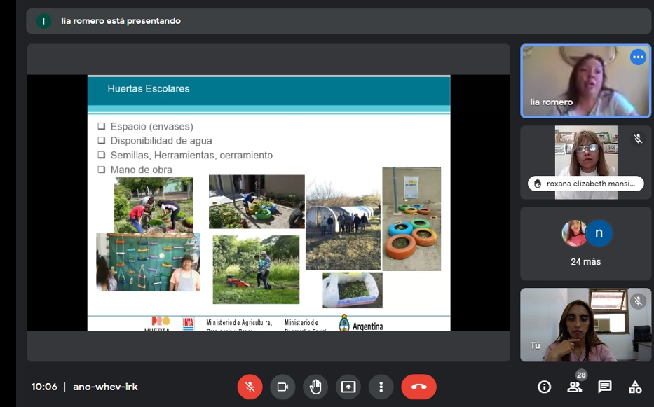 La reunión que se desarrolló a través de la plataforma Google Meet, tuvo como principal objetivo orientar a directivos sobre la realización de huertas escolares en el nivel inicial. Asimismo, se brindaron precisiones sobre los tipos de huertas, el acceso a las semillas por parte del programa Pro Huerta, el aprovechamiento y uso de los alimentos que se obtienen en la misma, para una alimentación saludable y variada en el ámbito escolar.
