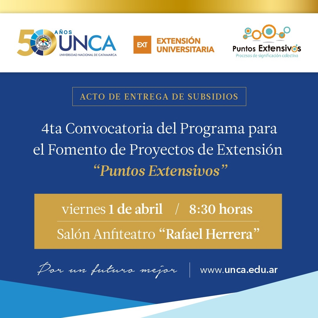 Mañana a las 8:30 horas en el Salón Anfiteatro Rafael Herrera, ubicado en la Facultad de Ciencias Agrarias de la UNCA, se realizará el acto de entrega de subsidios a los proyectos presentados en el marco de la 4ta Convocatoria del Programa para el Fomento de Proyectos de Extensión “Puntos Extensivos”, que fueran aprobados para su correspondiente financiamiento.