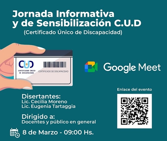 El Ministerio de Educación a través de la Dirección de Educación Especial recuerda a la comunidad docente que este martes 8 de marzo se llevará a cabo la primera “Jornada Informativa y de Sensibilización C.U.D” (Certificado Único de Discapacidad), bajo la modalidad virtual. La misma, contará con la disertación de las licenciadas Cecilia Moreno y Eugenia Tartaggia, de la dirección de Asistencia Integral a Personas con Discapacidad, del Ministerio de Salud.