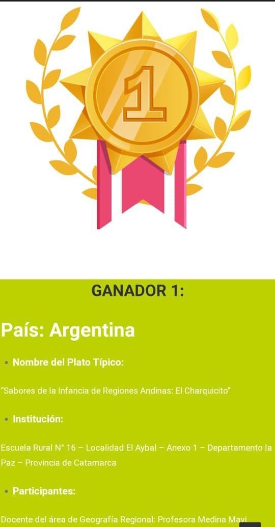 El trabajo "Sabores de la Infancia de Regiones Andinas: El Charquicito" realizado por alumnos y docentes de la Escuela Rural N° 16, Anexo 1, El Aybal, departamento la Paz que representó a nuestro país en el "XVIII Encuentro Juvenil Latinoamericano de Ciencia, Tecnología, Innovación y Emprendimientos" llevado a cabo en la ciudad de Ambato, República de Ecuador, resultó ganador del primer premio en el "Concurso video y descripción de plato típico de la región y el país de origen".
