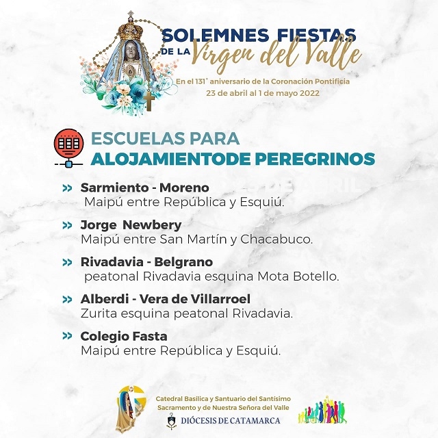 Además, se recuerda que las escuelas que han sido coordinadas con el Obispado de Catamarca, destinadas al hospedaje de los peregrinos son los siguientes: