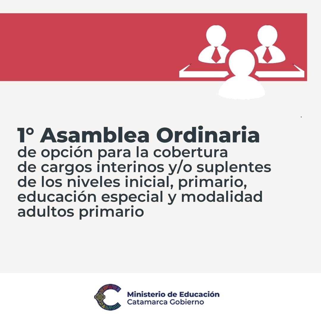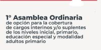 El Ministerio de Educación a través de la Secretaría de Gestión Educativa comunica que por Resolución SGE (ME) Nº 08 se autoriza a la realización de la 1° ASAMBLEA ORDINARIA DE OPCIÓN PARA LA COBERTURA DE CARGOS INTERINOS Y/O SUPLENTES para las instituciones educativas de los niveles inicial, primario, educación especial y modalidad adultos primario, de gestión estatal pública, a llevarse a cabo el día Sábado 09 de abril de 2022, en todas las Escuelas Cabeceras departamentales habilitadas.