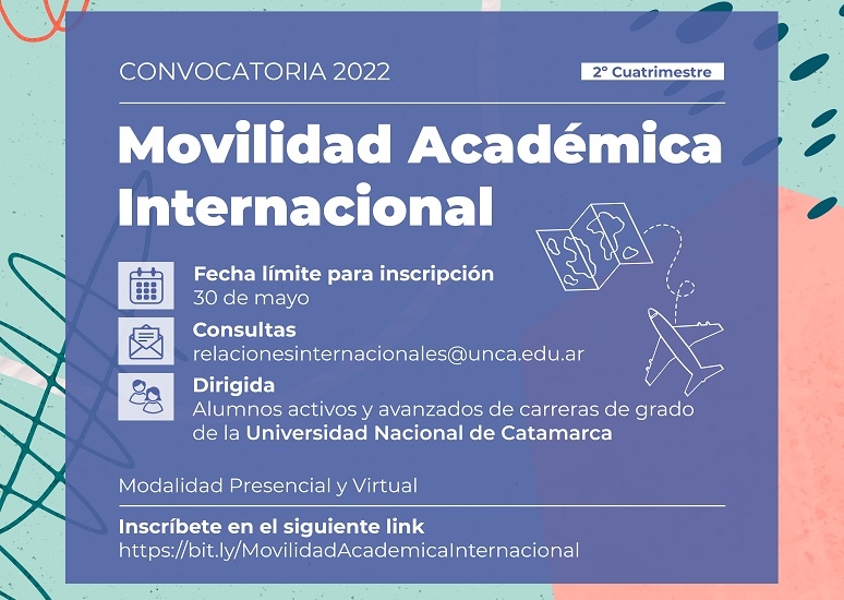A todos los aspirantes se les informa que para obtener más información pueden concurrir, presencialmente, a la Subsecretaría de Relaciones Institucionales e Internacionales ubicada en Esquiú 799- UNCA, vía correo electrónico, escribiendo a [email protected] o inscribirse mediante el link https://bit.ly/MovilidadAcademicaInternacional