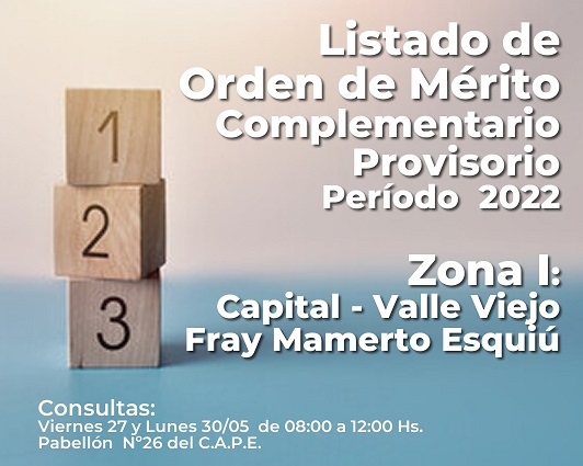 El Ministerio de Educación y la Junta de Clasificación de Enseñanza Media, Técnica y Artística, informa a los docentes de Nivel Secundario DE ZONA I: CAPITAL, VALLE VIEJO y F.M.E, que se encuentra publicado el LISTADO DE ORDEN DE MÉRITO COMPLEMENTARIO 2022 para dicha Zona.