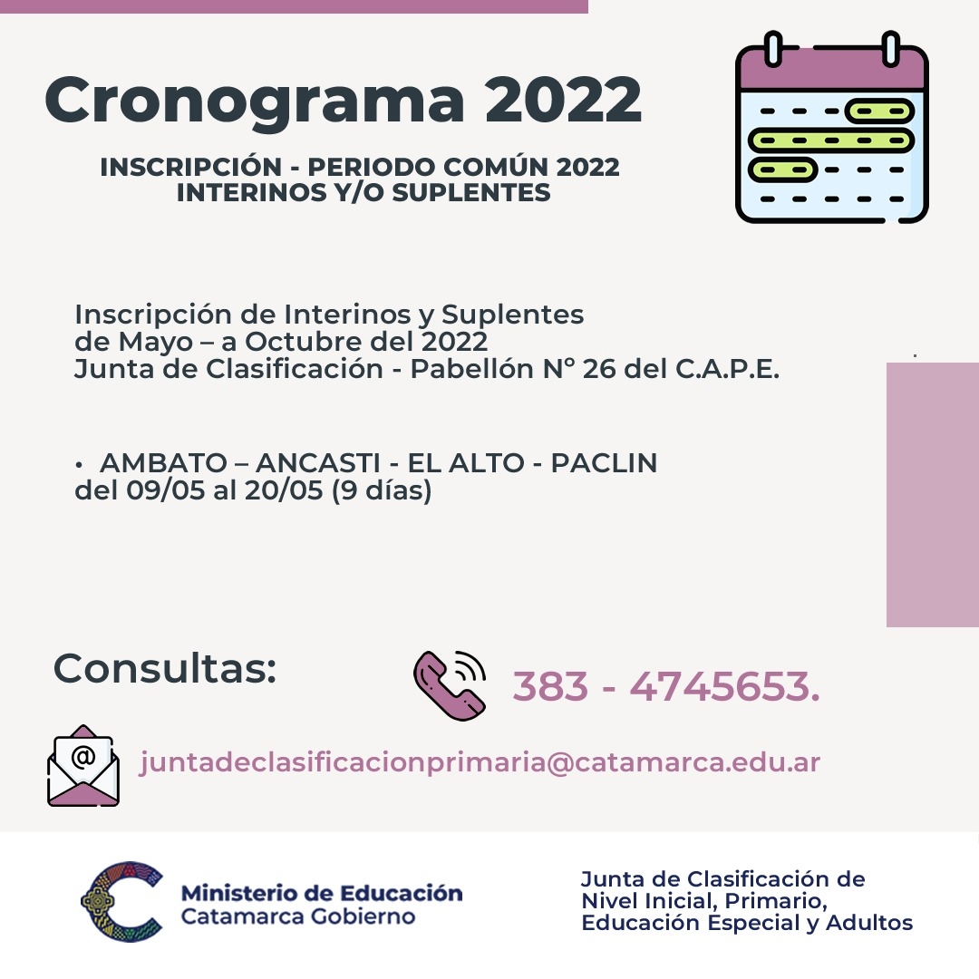 El Ministerio de Educación y la Junta de Clasificación de Nivel Inicial, Primaria, Especial y Adultos recuerda a los docentes que desde el lunes 9 al viernes 20 de mayo (excepto el día 11 feriado provincial) se llevarán a cabo las “inscripciones y reinscripciones para el Periodo Común 2022” para los departamentos Ambato, Ancasti, El Alto y Paclín.