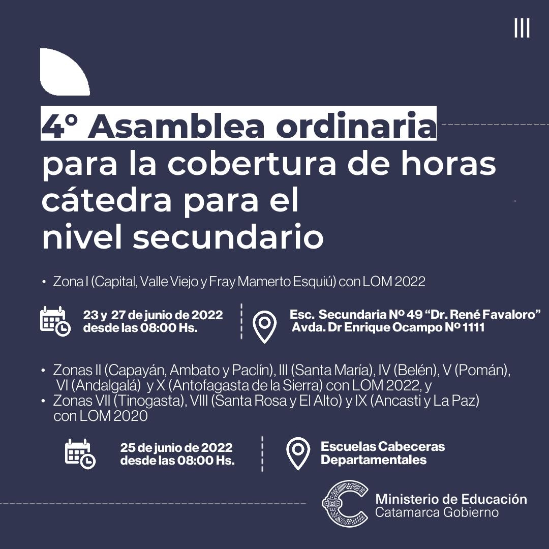 Los listados pueden ser consultados en: https://web.catamarca.edu.ar/sitio/noticias/5924-4-asamblea-ordinaria-para-la-cobertura-de-horas-catedra-para-el-nivel-secundario.html