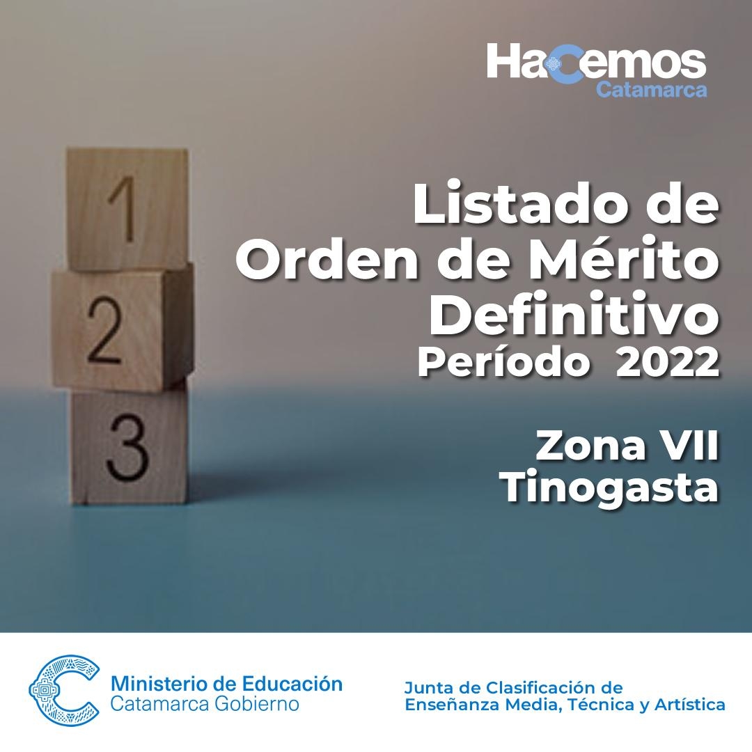 El Ministerio de Educación y la Junta de Clasificación de Enseñanza Media, Técnica y Artística, informa a los docentes DE ZONA VII: TINOGASTA que se encuentra publicado el LISTADO DE ORDEN DE MÉRITO DEFINITIVO 2022 para dicha Zona