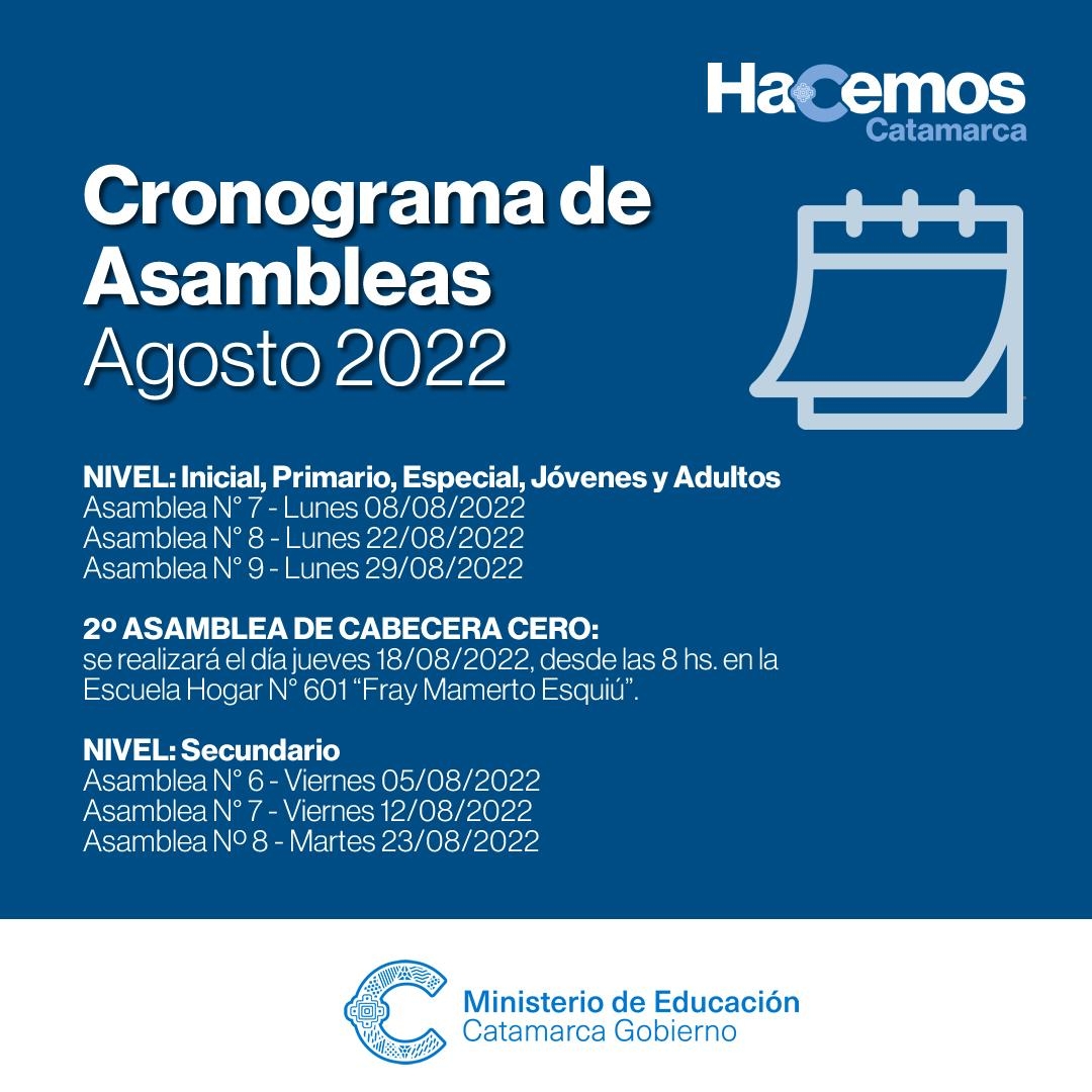 2º ASAMBLEA DE CABECERA CERO: se realizará el día jueves 18/08/2022, desde las 8 hs. en la Escuela Hogar N° 601 “Fray Mamerto Esquiú”.