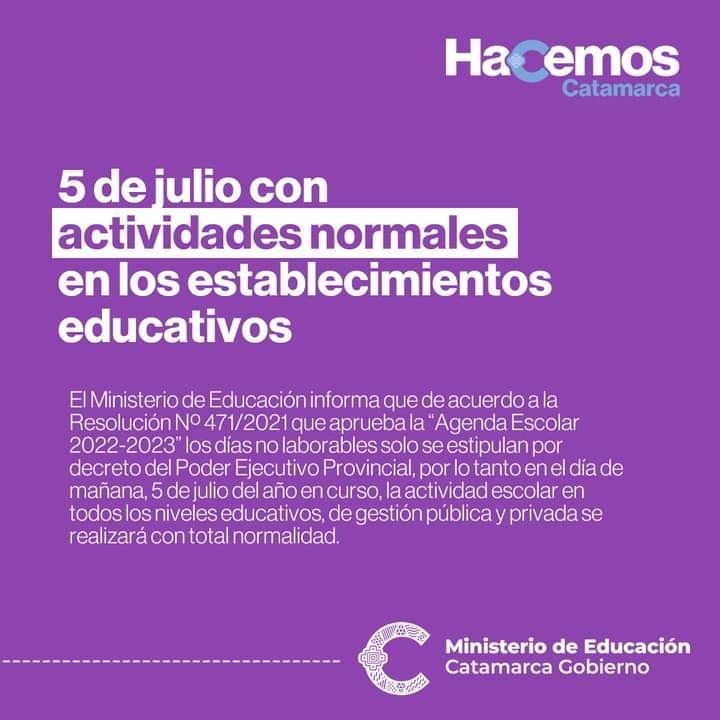El Ministerio de Educación informa que de acuerdo a la Resolución Nº 471/2021 que aprueba la “Agenda Escolar 2022-2023” los días no laborables solo se estipulan por decreto del Poder Ejecutivo Provincial, por lo tanto en el día de mañana, 5 de julio del año en curso, la actividad escolar en todos los niveles educativos, de gestión pública y privada se realizará con total normalidad.