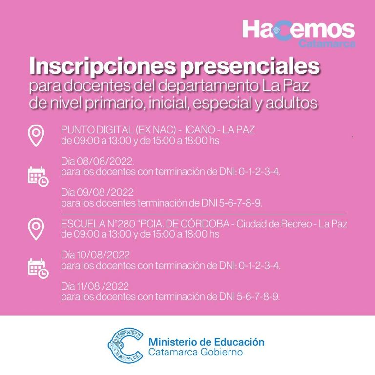 LUGAR: ESCUELA N°280 “PCIA. DE CÓRDOBA - CIUDAD DE RECREO - LA PAZ de 9 a 13 hs y de 15 a 18 hs.
