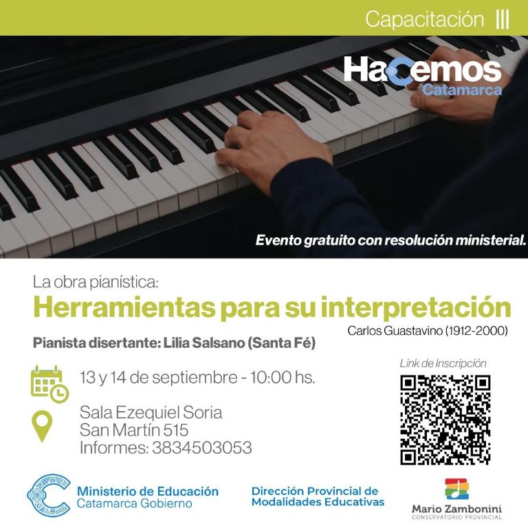 El evento es gratuito, cuenta con Resolución Ministerial y tendrá lugar los días 13 y 14 septiembre, a partir de las 10 horas, en la sala "Ezequiel Soria", sita en San Martín N°515, donde se interpretarán las obras del reconocido compositor u otros autores argentinos, en piano, ensambles de guitarra y violín. También se podrá asistir en calidad de oyente.