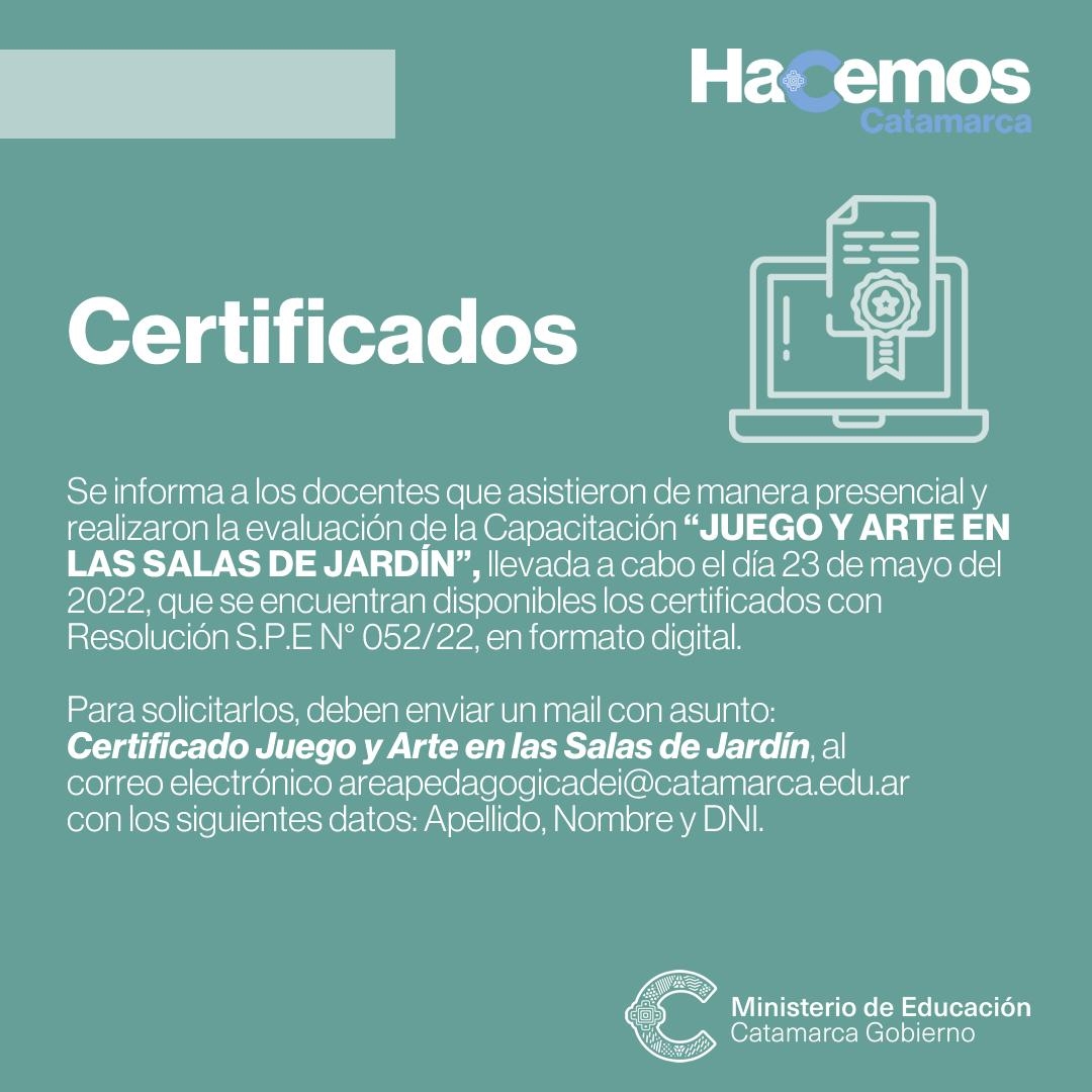 Para solicitarlos deben enviar un mail con asunto: Certificado Juego y Arte en las Salas de Jardín, al correo electrónico [email protected] con los siguientes datos: Apellido, Nombre y DNI.