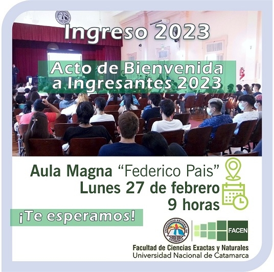 El lunes 27 de febrero, a las 9 horas, en el Aula Magna “Federico Pais” de la UNCA, se realizará el acto de bienvenida a los ingresantes 2023 que comienzan a cursar las carreras que se dictan en la Facultad de Ciencias Exactas y Naturales de la Universidad Nacional de Catamarca.