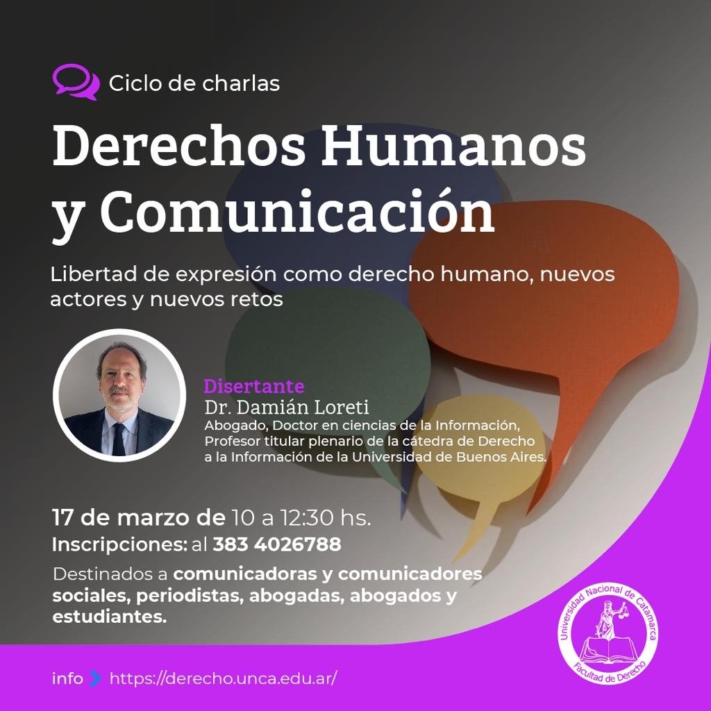La Facultad de Derecho de la Universidad Nacional de Catamarca, invita a comunicadoras y comunicadores sociales, periodistas, alumnos, alumnas e interesados en la temática en particular, a participar del Conversatorio “Libertad de expresión como derechos humanos, nuevos actores y nuevos retos”, que desarrollará mañana viernes 17 de marzo de 10 a 12:30 hs, el Dr. Damián Loreti.