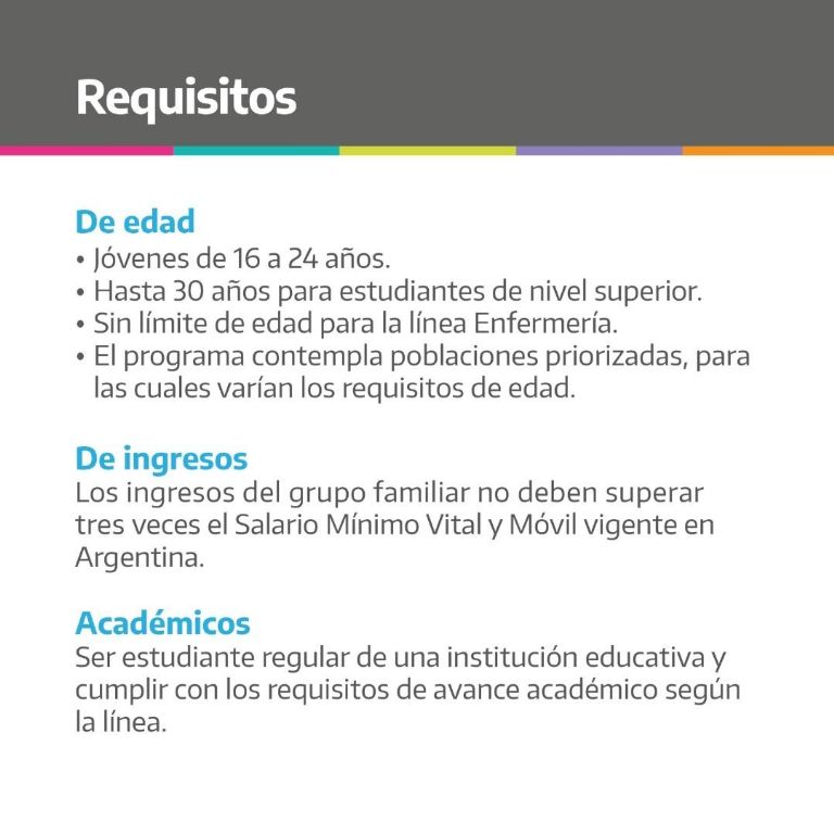 Por otro lado, los ingresos del grupo familiar no deben superar tres veces el Salario Mínimo Vital y Móvil vigente en Argentina y los postulantes deberán acreditar la asistencia a una institución educativa y cumplir con los requisitos de avance académico según la línea.