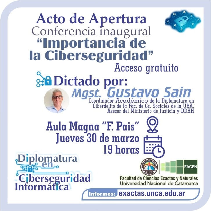 Al finalizar el acto central, se brindará una conferencia inaugural que estará a cargo del Mgter. Gustavo Sain, coordinador Académico de la Diplomatura en Ciberdelito de la Facultad de Ciencias Sociales de la UBA y asesor del Ministerio de Justicia y Derechos Humanos de la Nación, quien se referirá a la temática de "La Importancia de la Ciberseguridad”.