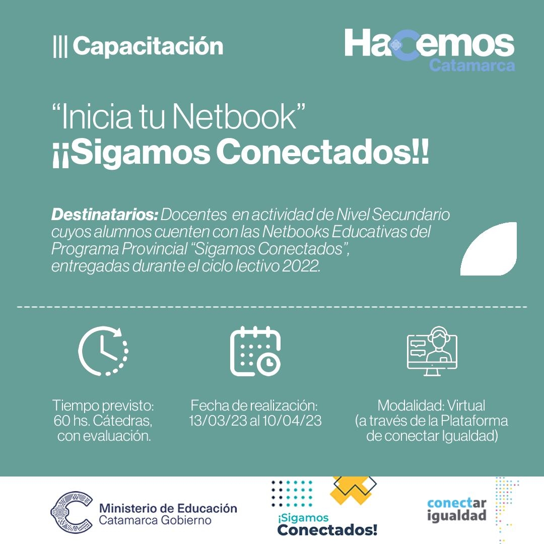La capacitación virtual, dará inicio el lunes 13 de marzo hasta el lunes 10 de abril, a través de la “Plataforma Conectar Igualdad”, tendrá una duración de 5 semanas con una carga horaria de 60 horas cátedra con evaluación final. Los interesados en participar de la propuesta podrán inscribirse a través del siguiente link: