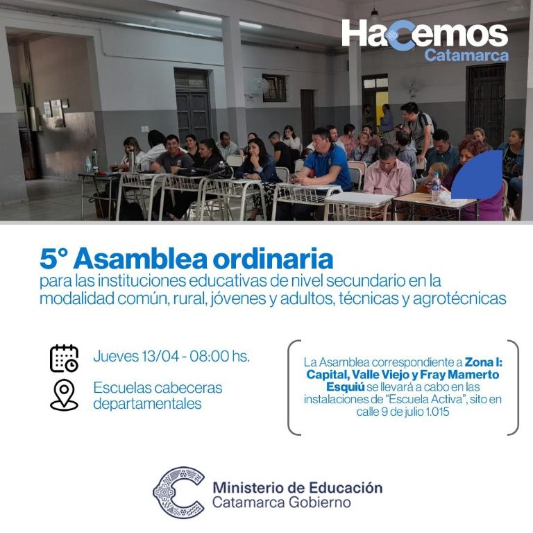 La Asamblea correspondiente a Zona I: Capital, Valle Viejo y Fray Mamerto Esquiú se llevará a cabo en las instalaciones de “Escuela Activa”, sito en calle 9 de julio 1.015 (esquina Mate de Luna) de San Fernando del Valle de Catamarca, según el siguiente cronograma de llamado: