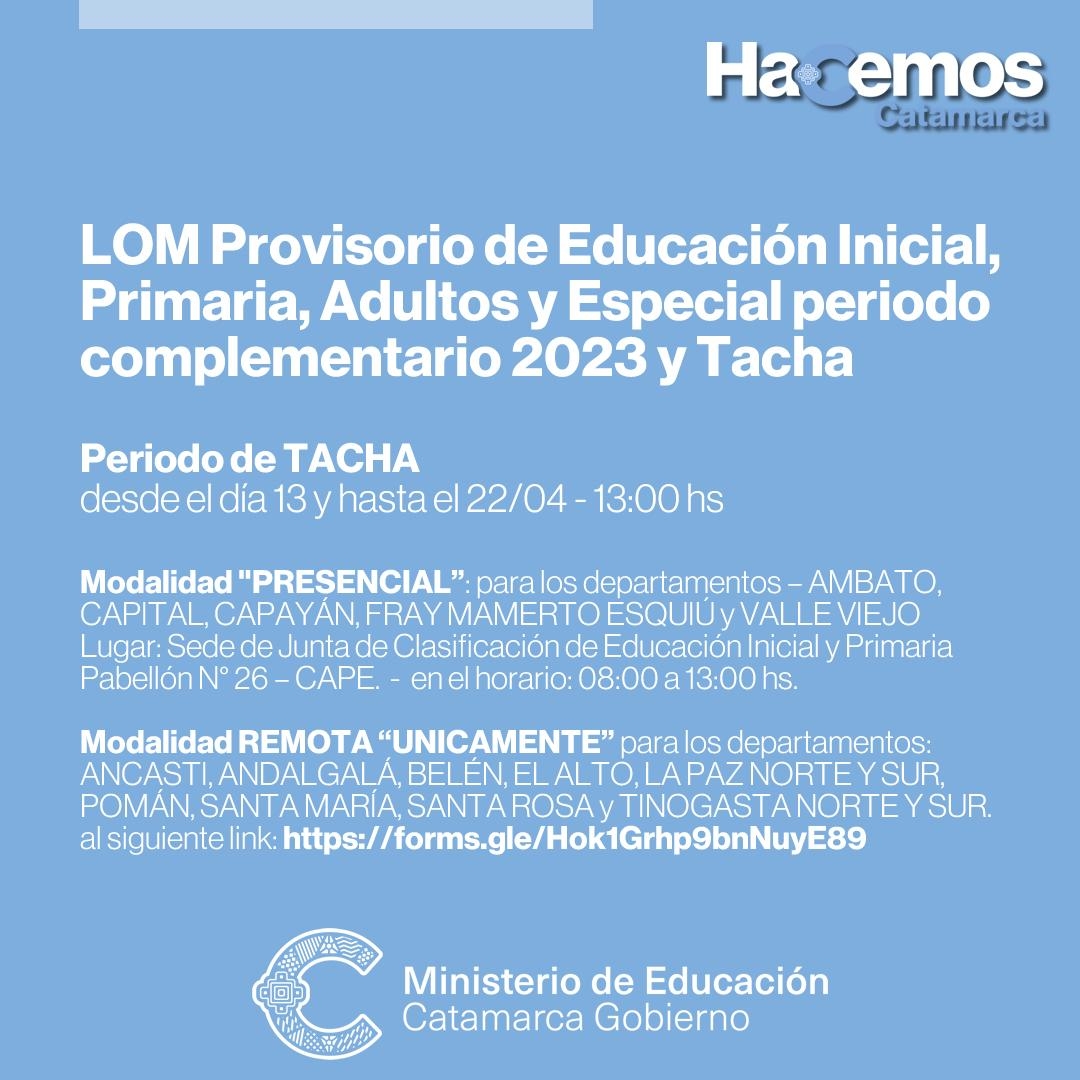 Asimismo, se indica que el periodo de TACHA para el mencionado LOM correspondiente al PERIODO COMPLEMENTARIO 2023 se llevará a cabo desde el día 13 y hasta el 22 de abril del año en curso a las 13:00 horas inclusive, conforme el siguiente detalle para cada caso: