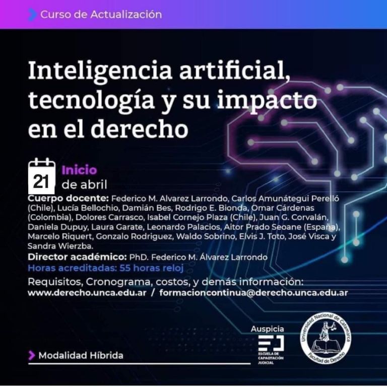 Por otro lado, el día 21 comienza el Curso de Actualización "Inteligente artificial, tecnología y su impacto en el derecho", bajo la dirección de Federico Álvarez Larrondo.