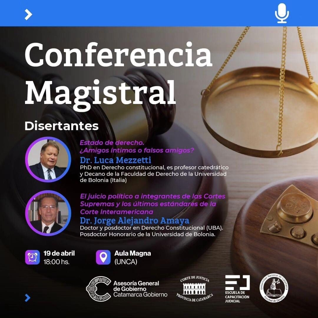 En el Aula Magna de la Universidad Nacional de Catamarca se llevará a cabo la conferencia magistral que estará a cargo de los destacados juristas Dr. Luca Mezzetti y Jorge Alejandro Amaya. La actividad es organizada por Facultad de Derecho de la Universidad Nacional de Catamarca y cuenta con el auspicio de la Asesoría General de Gobierno, la Corte de Justicia y la Escuela de Capacitación Judicial. La conferencia magistral se desarrollará a las 18, con entrada libre y gratuita.