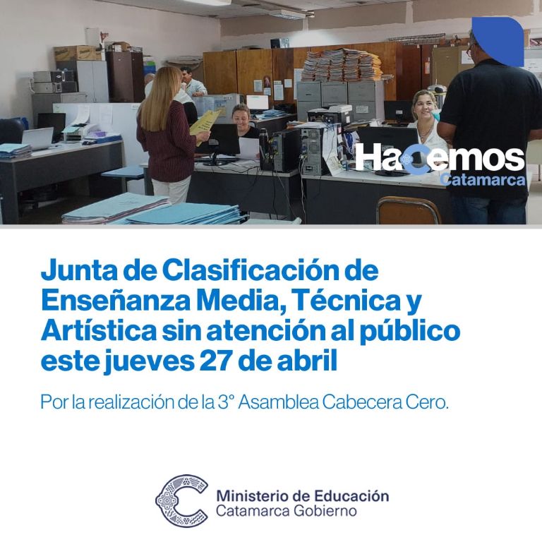 El Ministerio de Educación y la Junta de Clasificación de Enseñanza Media, Técnica y Artística informa a docentes de nivel secundario en todas sus modalidades que el jueves 27 del corriente no habrá atención al público en la sede del organismo, ubicado en el Pabellón 26 del CAPE, por encontrarse el personal abocado a la realización de la 3° Asamblea Cabecera Cero.