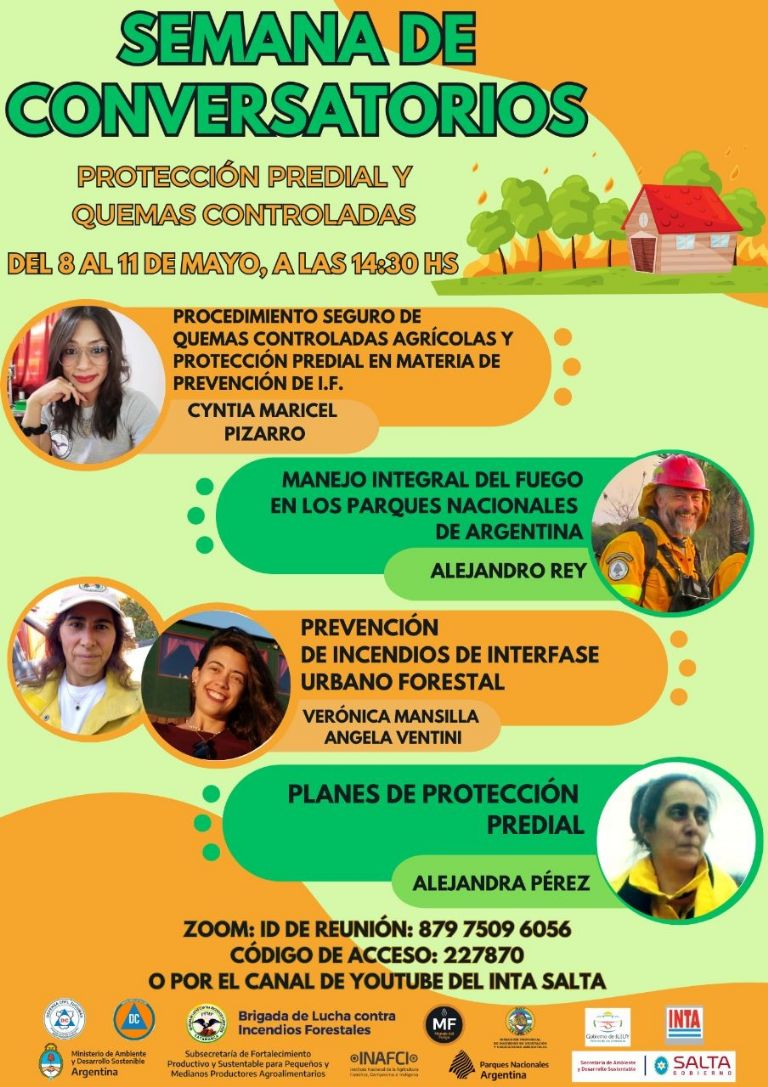 Durante la semana del 8 al 11 de mayo, se realizará una serie de conversatorios/capacitaciones, que abordarán temáticas vinculadas a la protección predial y quemas controladas. Están organizados por distintos organismos, como la Brigada de Incendios Forestales de Catamarca, INTA Salta, Defensa Civil, Parques Nacionales Argentina, entre otros.