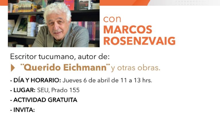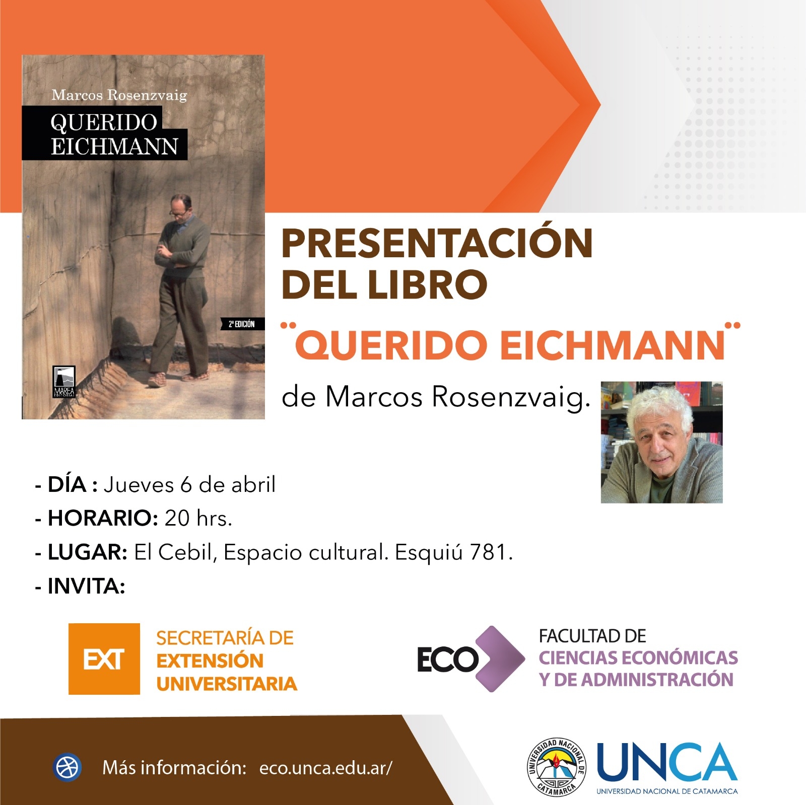 Finalmente, en horas de la tarde se realizará la presentación de su libro “Querido Eichmann”, en el Espacio Cultural, El Cebil en Esquiú 781, a partir de las 20 horas.