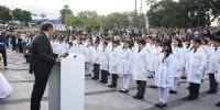 Leyó luego la promesa formal: “Alumnos y alumnas, ¿Prometen respetar y hacer respetar los derechos, deberes y garantías que la Constitución Nacional y la Constitución Provincial establecen, hacer todo lo que esté a vuestro alcance para cumplir y hacer cumplir sus preceptos y disposiciones, y respetar la autoridad de las Instituciones que de ella emanan?”.