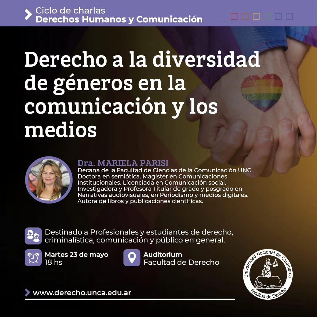 La Facultad de Derecho de la Universidad Nacional de Catamarca (UNCA) ha anunciado el tercer encuentro del Ciclo de Charlas de Derechos Humanos y Comunicación, el cual se llevará a cabo este martes 23 de mayo a las 18:00 horas en el Auditorio de la Facultad. El evento contará con la destacada presencia de Mariela Parisi, decana de la Facultad de Ciencias de la Comunicación de la Universidad Nacional de Córdoba (UNC), quien disertará sobre el tema "Derecho a la diversidad de géneros en la comunicación y los medios".