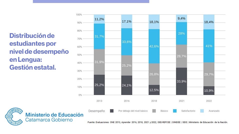 Los resultados mostraron que, en Catamarca, en Lengua, los alumnos/as de escuelas estatales de la provincia pasaron en 2021 de un 9,4% en su desempeño académico avanzado a un 18,4% en 2022, es decir, el doble. También aumentaron de 28% a 41% el nivel de estudios con calificaciones satisfactorias. Y en este sentido también se redujo notablemente la brecha de estudiantes que no alcanzaban niveles de desempeño por debajo del nivel básico que pasó de un 33,9% en 2021 al solo un 10,9% en 2022.