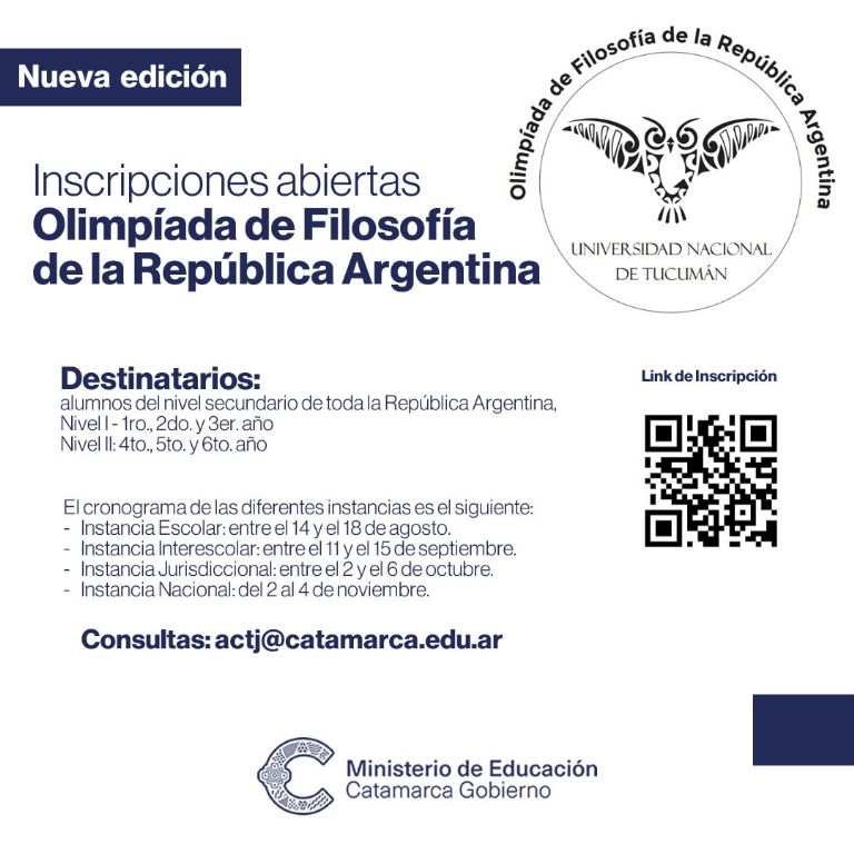 El Ministerio de Educación a través de la Coordinación de Actividades Científicas y Tecnológicas Juveniles (ACTJ), dependiente de la Secretaría de Gestión Educativa, invita a docentes y alumnos de toda la provincia a participar de una nueva edición de la Olimpíada de Filosofía de la República Argentina. La temática a concursar este año es “Sujetos en la era de la tecnociencia”.