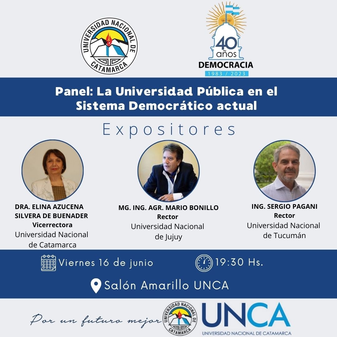 El evento contará con las disertaciones de la vicerrectora de la UNCA, Dra. Elina Silvera de Buenader, el Rector de la Universidad Nacional de Jujuy, Ing. Mario Bonillo, y el rector de la Universidad Nacional de Tucumán, Ing. Sergio Pagani.