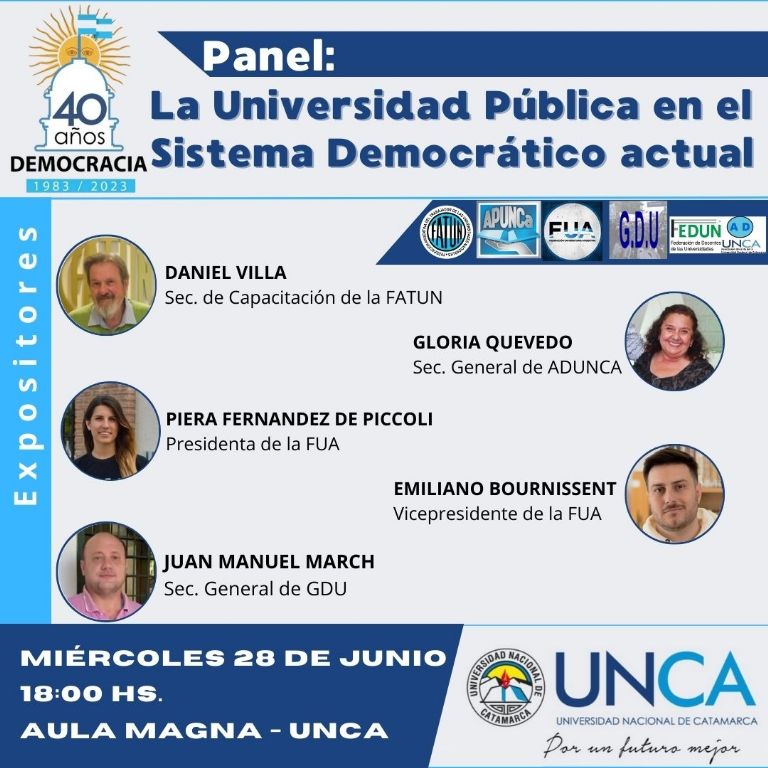 Las disertaciones estarán a cargo del Secretario de Capacitación de la FATUN, Daniel Vila, la presidenta de la FUA Piera Fernandez de Piccoli, el vicepresidente de la FUA Emiliano Bournissent, y Gloria Quevedo Sec. General de ADUNCA.