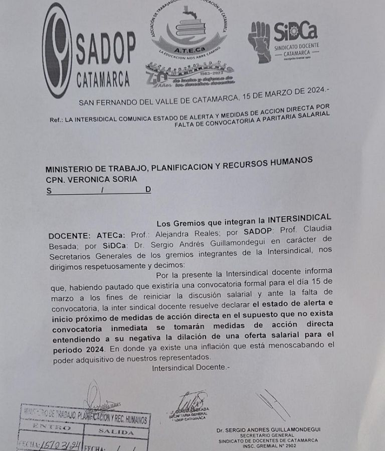 Ante esto, se decararon en estado de alerta y advirtieron que de no producirse el llamado urgente por parte del Gobierno, iniciarán medidas de fuerza en los próximos días.