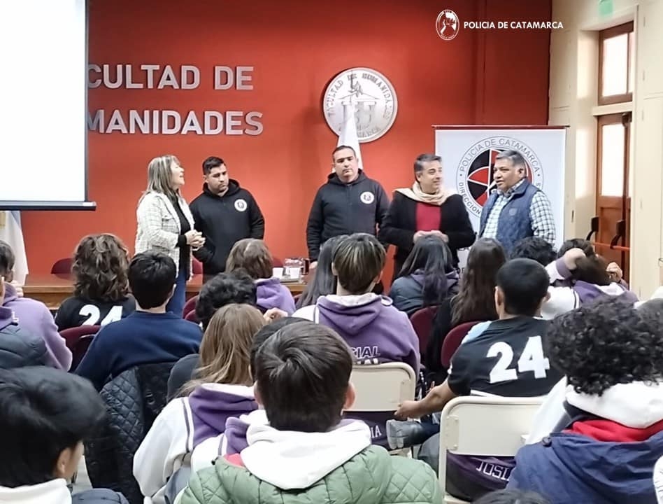 Continuando con el programa de charlas de prevención y concientización, dirigidas a la Comunidad Educativa de la Provincia, personal de la División Prevención y Docencia de la Dirección Drogas Peligrosas de la Policía de la Provincia, en la mañana del pasado viernes, bajo los lineamientos de trabajo dispuestos desde el Ministerio de Seguridad y la Jefatura General de Policía, en el Salón Auditório de la Facultad de Humanidades, brindó una charla de prevención, informativa y de concientización sobre el consumo problemático de drogas, dirigida a docentes y alumnos de las Escuelas Pre Universitarias.