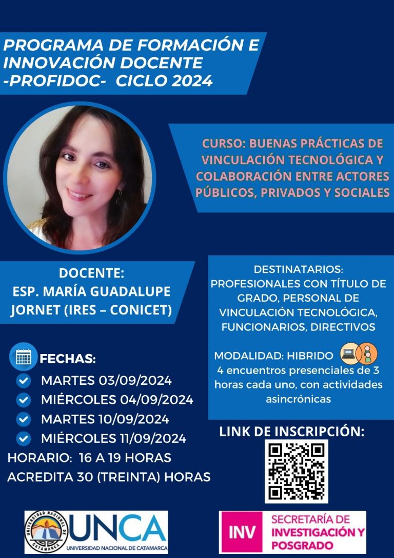 Por un lado, el curso de “Formulación de Proyectos de Vinculación y Transferencia: Crear valor a partir de la investigación”. En este periodo se ofrecen las siguientes propuestas, que estarán a cargo de la Esp. María Guadalupe Jornet (IRES – CONICET), docente con gran y valiosa trayectoria en la temática; formulación de proyectos de vinculación y transferencia: crear valor a partir de la investigación.
