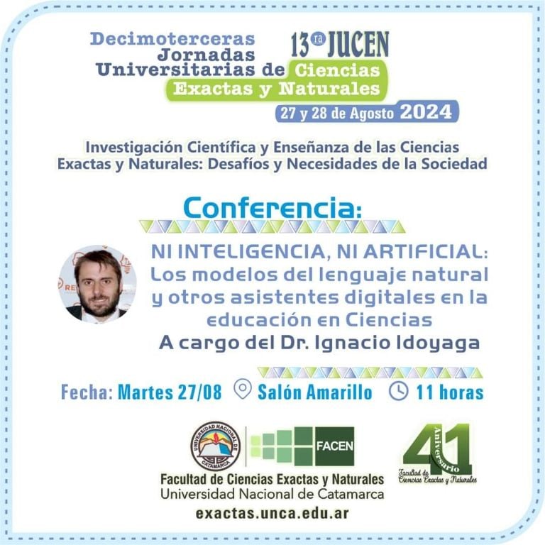 El acto central será en el Salón Amarillo de la UNCA, a las 10:00 hs., tras lo cual se desarrollará la conferencia inaugural titulada “Ni inteligencia, ni artificial: los modelos de lenguaje natural y otros asistentes digitales en la educación en Ciencias”, a cargo del Dr. Ignacio Idoyaga, a partir de las 11 hs..