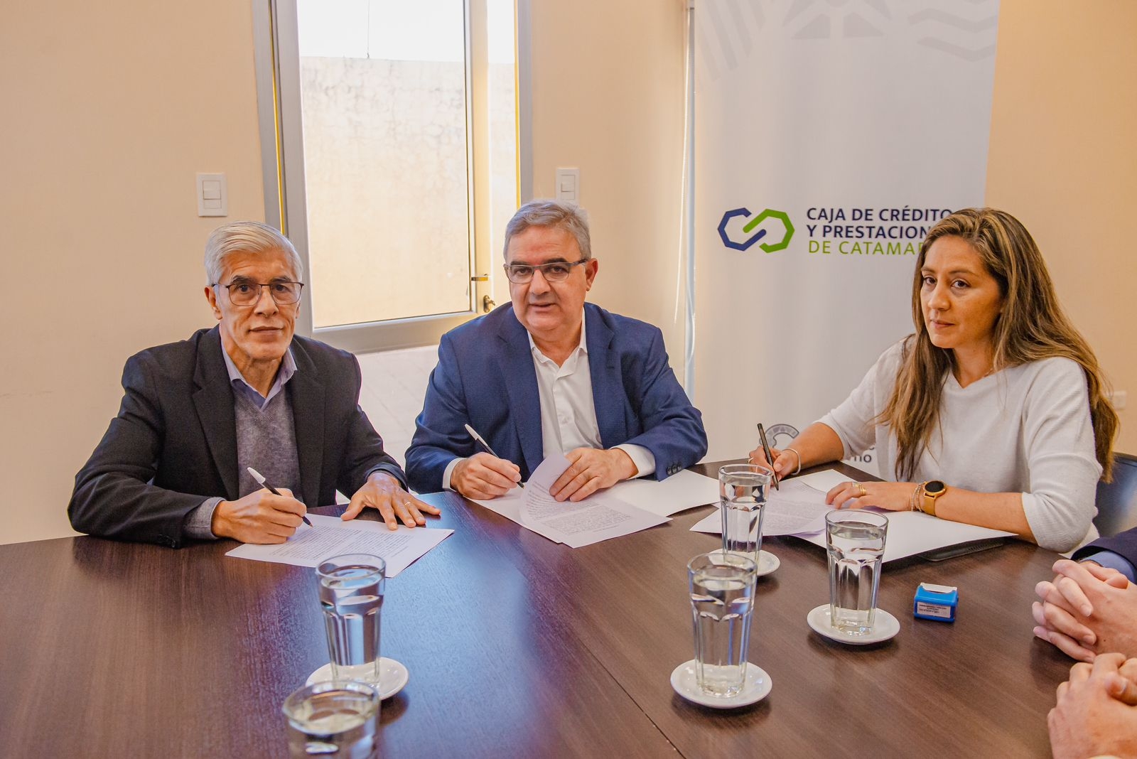 La ceremonia se desarrolló en instalaciones del organismo provincial y contó con la presencia, además del mandatario provincial, de los integrantes del directorio que conforman la Caja de Créditos encabezados por su presidenta Daniela Díaz, los directores Maximiliano Rivera y Ariel Luna, y el rector de la Universidad catamarqueña, Oscar Arellano.