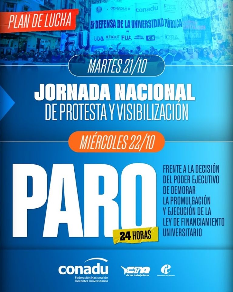 El pasado viernes, luego de un plenario donde hubo una participación de gremios de docentes universitarios de todo el país, se llegó a la decisión de convocar a una jornada nacional de protestas para este martes 21 de octubre, mientras que el miércoles 22 de octubre habrá un paro nacional.
