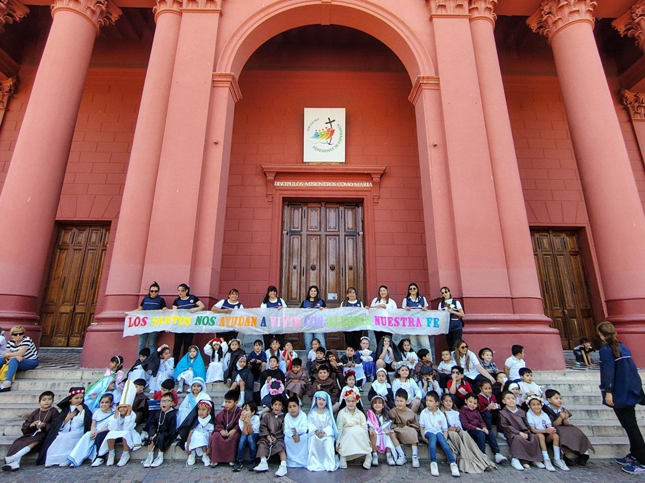 Caracterizados o con algún detalle de un Santo en particular, los niños celebraron a los amigos de Jesús. Con entusiasmo, recorrieron el principal paseo público de la ciudad capital entregando estampitas a los ocasionales transeúntes o vendedores apostados en el lugar.
