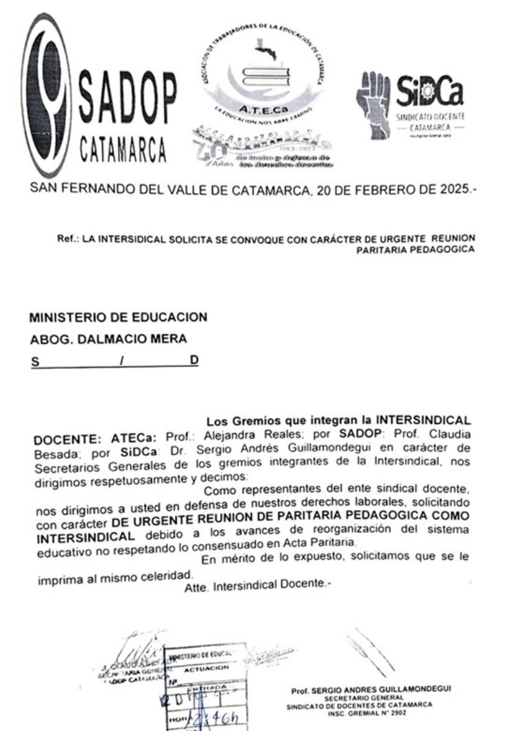 La Intersindical Docente, integrada por los gremios ATECA, SIDCA y SADOP, solicitó al Ministerio de Educación, a cargo de Dalmacio Mera, la convocatoria a paritaria pedagógica "urgente".