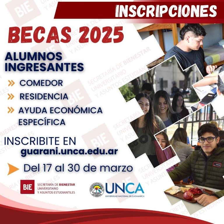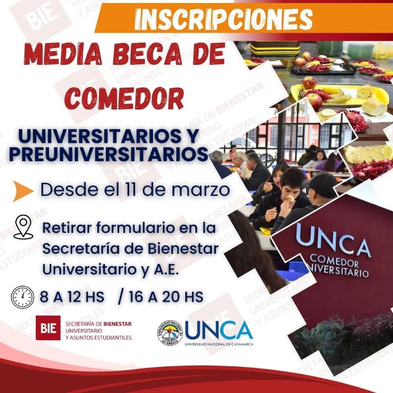 La Secretaría de Bienestar Universitario y Asuntos Estudiantiles de la Universidad Nacional de Catamarca, informa que a partir del 11 de marzo se abren las inscripciones a la MEDIA BECA DE COMEDOR, destinada a los estudiantes universitarios y de las escuelas preuniversitarias Fray Mamerto Esquiú y E.N.E.T. Nº 1 “Prof. Vicente García Aguilera”.