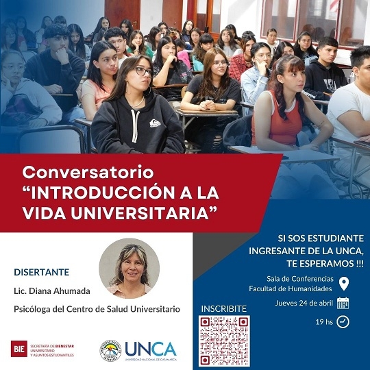 La Secretaría de Bienestar Universitario y Asuntos Estudiantiles de la Universidad Nacional de Catamarca invita a todos los estudiantes ingresantes a la UNCA en 2025 a participar del conversatorio de “Introducción a la Vida Universitaria” el jueves 24 de abril a las 19 hs en la Sala de Conferencias de la Facultad de Humanidades.