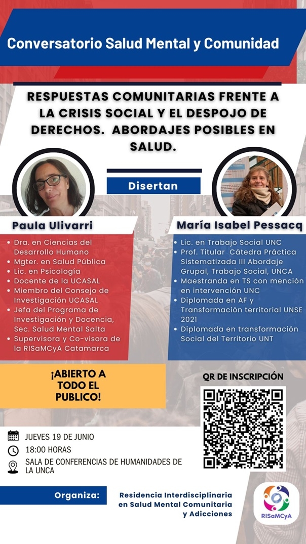 El conversatorio contará con la presentación de la Lic. especialista en Psicología Comunitaria Paula Ulivarri, la Lic. en Trabajo Social María Isabel Pessacq y el equipo de 2° año de la Residencia, que realiza su práctica comunitaria en el CAPS Banda de Varela.